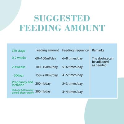 | Old Age or Recovering after Surgery | 300 ml | 3–4 times/day |