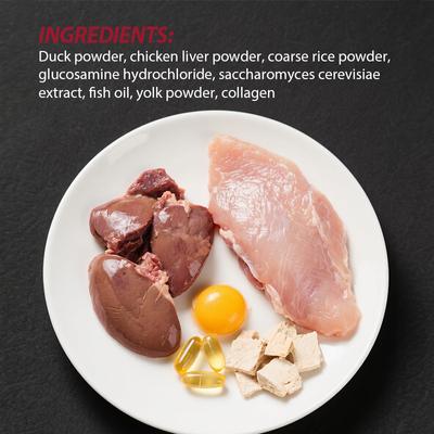 Active Ingredients: Duck Powder, Chicken Liver Powder, Coarse Rice Powder, Glucosamine Hydrochloride, Yeast Extract, Fish Oil, Egg Yolk Powder, Collagen.