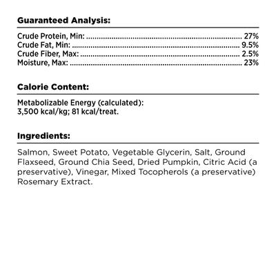 Salmon, Sweet Potato, Vegetable Glycerin, Ground Flaxseed, Ground Chia Seed, Dried Pumpkin, Salt, Citric Acid (A Preservative), Vinegar, Mixed Tocopherols (A Preservative), Rosemary Extract.