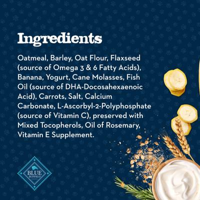 Oatmeal, Barley, Oat Flour, Flaxseed (source of Omega 3 & 6 Fatty Acids), Banana, Yogurt, Cane Molasses, Fish Oil (source of DHA-Docosahexaenoic Acid), Carrots, Salt, Calcium Carbonate, L-Ascorbyl-2-Polyphosphate (source of Vitamin C), preserved with Mixed Tocopherols, Oil of Rosemary, Vitamin E Supplement.