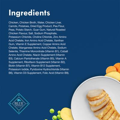 Chicken, Chicken Broth, Water, Chicken Liver, Carrots, Potatoes, Dried Egg, Pea Flour, Peas, Potato Starch, Guar Gum, Natural Grilled Chicken Flavor, Salt, Sodium Phosphate, Potassium Chloride, Choline Chloride, Zinc Amino Acid Chelate, Iron Amino Acid Chelate, Xanthan Gum, Vitamin E Supplement, Copper Amino Acid Chelate, Manganese Amino Acid Chelate, Sodium Selenite, Thiamine Mononitrate (Vitamin B1), Cobalt Amino Acid Chelate, Niacin Supplement (Vitamin B3), Calcium Pantothenate (Vitamin B5), Vitamin A Supplement, Riboflavin Supplement (Vitamin B2), Biotin (Vitamin B7), Vitamin B12 Supplement, Potassium Iodide, Pyridoxine Hydrochloride (Vitamin B6), Vitamin D3 Supplement, Folic Acid (Vitamin B9).