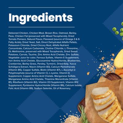 Deboned Chicken, Chicken Meal, Brown Rice, Oatmeal, Barley, Peas, Chicken Fat (preserved with Mixed Tocopherols), Dried Tomato Pomace, Natural Flavor, Flaxseed (source of Omega 3 & 6 Fatty Acids), Dried Yeast, Salt, Direct Dehydrated Alfalfa Pellets, Potassium Chloride, Dried Chicory Root, Alfalfa Nutrient Concentrate, Calcium Carbonate, Choline Chloride, L-Threonine, DL-Methionine, preserved with Mixed Tocopherols, Dried Sweet Potatoes, Carrots, Taurine, Zinc Amino Acid Chelate, Zinc Sulfate, Vegetable Juice for color, Ferrous Sulfate, Vitamin E Supplement, Iron Amino Acid Chelate, Glucosamine Hydrochloride, Blueberries, Cranberries, Barley Grass, Parsley, Turmeric, Dried Kelp, Yucca Schidigera Extract, Niacin (Vitamin B3), Calcium Pantothenate (Vitamin B5), Copper Sulfate, Biotin (Vitamin B7), L-Ascorbyl-2-Polyphosphate (source of Vitamin C), L-Lysine, Vitamin A Supplement, Copper Amino Acid Chelate, Manganese Sulfate, Manganese Amino Acid Chelate, Thiamine Mononitrate (Vitamin B1), Riboflavin (Vitamin B2), Vitamin D3 Supplement, Vitamin B12 Supplement, Pyridoxine Hydrochloride (Vitamin B6), Calcium Iodate, Folic Acid (Vitamin B9), Sodium Selenite, Oil of Rosemary