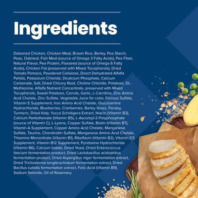 Deboned Chicken, Chicken Meal, Brown Rice, Barley, Pea Starch, Peas, Oatmeal, Fish Meal (source of Omega 3 Fatty Acids), Pea Fiber, Natural Flavor, Pea Protein, Flaxseed (source of Omega 6 Fatty Acids), Chicken Fat (preserved with Mixed Tocopherols), Dried Tomato Pomace, Powdered Cellulose, Direct Dehydrated Alfalfa Pellets, Potassium Chloride, Dicalcium Phosphate, Calcium Carbonate, Salt, Dried Chicory Root, Choline Chloride, Potatoes, DL-Methionine, Alfalfa Nutrient Concentrate, preserved with Mixed Tocopherols, Sweet Potatoes, Carrots, Garlic, L-Carnitine, Zinc Amino Acid Chelate, Zinc Sulfate, Vegetable Juice for color, Ferrous Sulfate, Vitamin E Supplement, Iron Amino Acid Chelate, Glucosamine Hydrochloride, Blueberries, Cranberries, Barley Grass, Parsley, Turmeric, Dried Kelp, Yucca Schidigera Extract, Niacin (Vitamin B3), Calcium Pantothenate (Vitamin B5), L-Ascorbyl-2-Polyphosphate (source of Vitamin C), L-Lysine, Copper Sulfate, Biotin (Vitamin B7), Vitamin A Supplement, Copper Amino Acid Chelate, Manganese Sulfate, Taurine, Chondroitin Sulfate, Manganese Amino Acid Chelate, Thiamine Mononitrate (Vitamin B1), Riboflavin (Vitamin B2), Vitamin D3 Supplement, Vitamin B12 Supplement, Pyridoxine Hydrochloride (Vitamin B6), Calcium Iodate, Dried Yeast, Dried Enterococcus faecium fermentation product, Dried Lactobacillus acidophilus fermentation product, Dried Aspergillus niger fermentation extract, Dried Trichoderma longibrachiatum fermentation extract, Dried Bacillus subtilis fermentation extract, Folic Acid (Vitamin B9), Sodium Selenite, Oil of Rosemary.