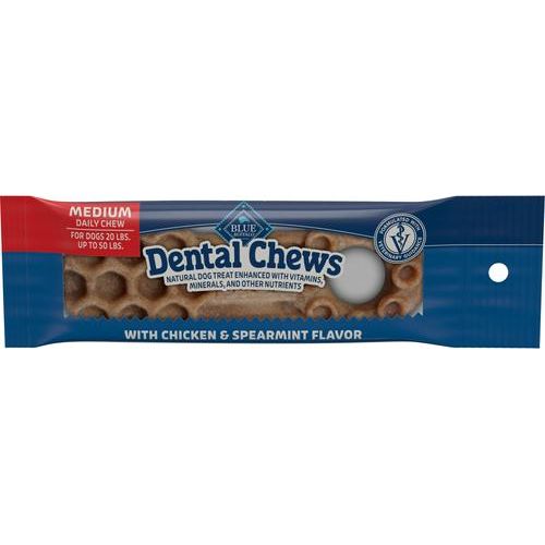 Una revolución dental canina está tomando forma. Los masticables dentales medianos Blue Buffalo para perros, premios para el cuidado dental diario con ingredientes naturales, pollo y hierbabuena, son los premios dentales diarios que le brindan a tu cachorro una limpieza tres en uno. Con su forma única, estos masticables promueven dientes y encías saludables, mientras que las 50 crestas y ranuras ayudan a controlar la placa y el sarro. Lo mejor de todo es que están hechos con pollo real para un sabor que encanta a los perros que mueven la cola, además de hierbabuena para refrescar el aliento. Y como todas las golosinas para perros Blue Buffalo, estos masticables dentales no contienen harinas de subproductos de pollo (ni de aves de corral), maíz, trigo, soja, sabores artificiales ni conservantes.