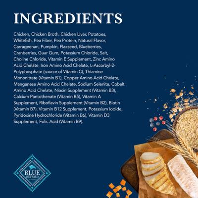 Chicken, Chicken Broth, Chicken Liver, Potatoes, Whitefish, Pea Fiber, Pea Protein, Natural Flavor, Carrageenan, Pumpkin, Flaxseed, Blueberries, Cranberries, Guar Gum, Potassium Chloride, Salt, Choline Chloride, Vitamin E Supplement, Zinc Amino Acid Chelate, Iron Amino Acid Chelate, L-Ascorbyl-2-Polyphosphate (source of Vitamin C), Thiamine Mononitrate (Vitamin B1), Copper Amino Acid Chelate, Manganese Amino Acid Chelate, Sodium Selenite, Cobalt Amino Acid Chelate, Niacin Supplement (Vitamin B3), Calcium Pantothenate (Vitamin B5), Vitamin A Supplement, Riboflavin Supplement (Vitamin B2), Biotin (Vitamin B7), Vitamin B12 Supplement, Potassium Iodide, Pyridoxine Hydrochloride (Vitamin B6), Vitamin D3 Supplement, Folic Acid (Vitamin B9).