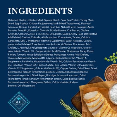 Deboned Chicken, Chicken Meal, Tapioca Starch, Peas, Pea Protein, Turkey Meal, Dried Egg Product, Chicken Fat (preserved with Mixed Tocopherols), Flaxseed (source of Omega 3 and 6 Fatty Acids), Pea Fiber, Natural Flavor, Potatoes, Apple Pomace, Pumpkin, Potassium Chloride, DL-Methionine, Cranberries, Choline Chloride, Calcium Sulfate, L-Threonine, Dried Kelp, Dried Chicory Root, Dehydrated Alfalfa Meal, Calcium Chloride, Alfalfa Nutrient Concentrate, Taurine, Calcium Carbonate, Salt, L-Tryptophan, Vitamin E Supplement, Sweet Potatoes, Carrots, preserved with Mixed Tocopherols, Iron Amino Acid Chelate, Zinc Amino Acid Chelate, L-Ascorbyl-2-Polyphosphate (source of Vitamin C), Vegetable Juice for color, Niacin (Vitamin B3), Copper Amino Acid Chelate, Blueberries, Barley Grass, Parsley, Turmeric, Yucca Schidigera Extract, Manganese Amino Acid Chelate, Thiamine Mononitrate (Vitamin B1), L-Lysine, Biotin (Vitamin B7), Vitamin A Supplement, Pyridoxine Hydrochloride (Vitamin B6), Calcium Pantothenate (Vitamin B5), Riboflavin (Vitamin B2), Ferrous Sulfate, Zinc Sulfate, Vitamin D3 Supplement, Vitamin B12 Supplement, Folic Acid (Vitamin B9), Copper Sulfate, Dried Yeast, Dried Enterococcus faecium fermentation product, Dried Lactobacillus acidophilus fermentation product, Dried Aspergillus niger fermentation extract, Dried Trichoderma longibrachiatum fermentation extract, Dried Bacillus subtilis fermentation extract, Manganese Sulfate, Calcium Iodate, Sodium Selenite, Oil of Rosemary.