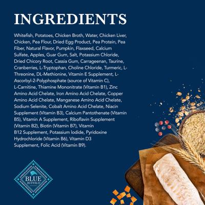 Whitefish, Potatoes, Chicken Broth, Water, Chicken Liver, Chicken, Pea Flour, Dried Egg Product, Pea Protein, Pea Fiber, Natural Flavor, Pumpkin, Flaxseed, Calcium Sulfate, Apples, Guar Gum, Salt, Potassium Chloride, Dried Chicory Root, Cassia Gum, Carrageenan, Taurine, Cranberries, L-Tryptophan, Choline Chloride, Turmeric, L-Threonine, DL-Methionine, Vitamin E Supplement, L-Ascorbyl-2-Polyphosphate (source of Vitamin C), L-Carnitine, Thiamine Mononitrate (Vitamin B1), Zinc Amino Acid Chelate, Iron Amino Acid Chelate, Copper Amino Acid Chelate, Manganese Amino Acid Chelate, Sodium Selenite, Cobalt Amino Acid Chelate, Niacin Supplement (Vitamin B3), Calcium Pantothenate (Vitamin B5), Vitamin A Supplement, Riboflavin Supplement (Vitamin B2), Biotin (Vitamin B7), Vitamin B12 Supplement, Potassium Iodide, Pyridoxine Hydrochloride (Vitamin B6), Vitamin D3 Supplement, Folic Acid (Vitamin B9).