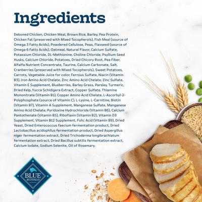 Deboned Chicken, Chicken Meal, Brown Rice, Barley, Oatmeal, Pea Starch, Menhaden Fish Meal (source of Omega 3 Fatty Acids), Peas, Powdered Cellulose, Chicken Fat (preserved with Mixed Tocopherols), Natural Flavor, Flaxseed (source of Omega 6 Fatty Acids), Pea Protein, Fish Oil (source of DHA-Docosahexaenoic Acid), DL- Methionine, Psyllium Seed Husks, Calcium Chloride, Choline Chloride, Potatoes, Potassium sulfate, L-Lysine, Dehydrated Alfalfa Meal, Pea Fiber, Alfalfa Nutrient Concentrate, Calcium Carbonate, Taurine, Potassium Chloride, Salt, Vitamin E Supplement, preserved with Mixed Tocopherols, Sweet Potatoes, Carrots, L-Ascorbyl-2-Polyphosphate (source of Vitamin C), L-Carnitine, Vegetable juice for color, Ferrous Sulfate, Niacin (Vitamin B3), Iron Amino Acid Chelate, Zinc Amino Acid Chelate, Zinc Sulfate, Blueberries, Cranberries, Barley Grass, Parsley, Turmeric, Dried Kelp, Yucca Schidigera Extract, Copper Sulfate, Thiamine Mononitrate (Vitamin B1), Copper Amino Acid Chelate, Biotin (Vitamin B7), Vitamin A Supplement, Manganese Sulfate, Manganese Amino Acid Chelate, Pyridoxine Hydrochloride (Vitamin B6), Calcium Pantothenate (Vitamin B5), Riboflavin (Vitamin B2), Vitamin D3 Supplement, Vitamin B12 Supplement, Folic Acid (Vitamin B9), Dried Yeast, Dried Enterococcus faecium fermentation product, Dried Lactobacillus acidophilus fermentation product, Dried Aspergillus niger fermentation extract, Dried Trichoderma longibrachiatum fermentation extract, Dried Bacillus subtilis fermentation extract, Calcium Iodate, Sodium Selenite, Oil of Rosemary.