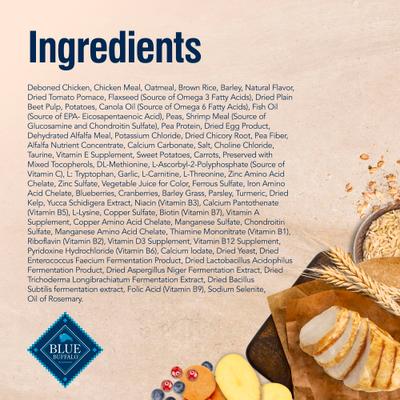 Deboned Chicken, Chicken Meal, Oatmeal, Brown Rice, Barley, Natural Flavor, Dried Tomato Pomace, Flaxseed (source of Omega 3 Fatty Acids), Dried Plain Beet Pulp, Potatoes, Canola Oil (source of Omega 6 Fatty Acids), Fish Oil (source of EPA-Eicosapentaenoic Acid), Peas, Shrimp Meal (source of Glucosamine and Chondroitin Sulfate), Pea Protein, Dried Egg Product, Dehydrated Alfalfa Meal, Potassium Chloride, Dried Chicory Root, Pea Fiber, Alfalfa Nutrient Concentrate, Calcium Carbonate, Salt, Choline Chloride, Taurine, Vitamin E Supplement, Sweet Potatoes, Carrots, preserved with Mixed Tocopherols, DL-Methionine, L-Ascorbyl-2-Polyphosphate (source of Vitamin C), L-Tryptophan, Garlic, L-Carnitine, L-Threonine, Zinc Amino Acid Chelate, Zinc Sulfate, Vegetable Juice for color, Ferrous Sulfate, Iron Amino Acid Chelate, Blueberries, Cranberries, Barley Grass, Parsley, Turmeric, Dried Kelp, Yucca Schidigera Extract, Niacin (Vitamin B3), Calcium Pantothenate (Vitamin B5), L-Lysine, Copper Sulfate, Biotin (Vitamin B7), Vitamin A Supplement, Copper Amino Acid Chelate, Manganese Sulfate, Chondroitin Sulfate, Manganese Amino Acid Chelate, Thiamine Mononitrate (Vitamin B1), Riboflavin (Vitamin B2), Vitamin D3 Supplement, Vitamin B12 Supplement, Pyridoxine Hydrochloride (Vitamin B6), Calcium Iodate, Dried Yeast, Dried Enterococcus faecium fermentation product, Dried Lactobacillus acidophilus fermentation product, Dried Aspergillus niger fermentation extract, Dried Trichoderma longibrachiatum fermentation extract, Dried Bacillus subtilis fermentation extract, Folic Acid (Vitamin B9), Sodium Selenite, Oil of Rosemary.