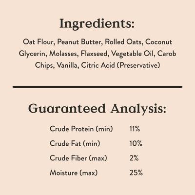 Oat Flour, Peanut Butter, Rolled Oatts, Coconut Glycerin, Molasses, Flaxseed, Vegetable Oil, Carob Chips, Vanilla, Citric Acid (Preservative).