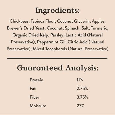 Chickpea, Tapioca Flour, Coconut Glycerin, Apples, Pea Fiber, Brewer's Dried Yeast, Salt, Coconut, Turmeric, Organic Dried Kelp, Parsley, Spinach, Lactic Acid (Natural Preservative), Peppermint Oil, Citric Acid (Natural Preservative), Mixed Tocopherols (Natural Preservative)