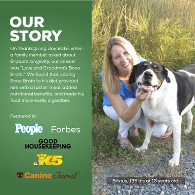 El caldo Brutus se puede disfrutar caliente o frío, solo como una bebida o refrigerio nutritivo, o como complemento del alimento seco de su perro. Muchos dueños de mascotas lo usan para reconstituir alimento deshidratado. Sirva aproximadamente 1/4 de taza de caldo por cada 11 kg de peso corporal por comida. Ajuste la cantidad según las necesidades individuales de su mascota.
