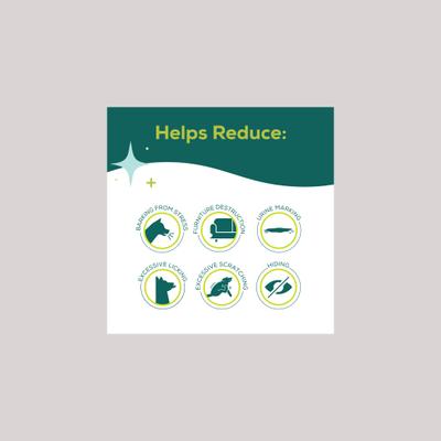 - Designed to help alleviate stress-induced negative behaviors like stress-induced barking, furniture destruction, urine marking, excessive licking, excessive scratching, and hiding.