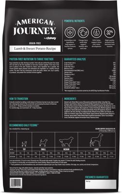 American Journey Lamb & Sweet Potato Recipe Grain-Free Dry Dog Food, 24-lb bag—American Journey is full of nutritious ingredients that fuel your pet’s everyday adventures. The Lamb & Sweet Potato Recipe Grain-Free Dry Dog Food formula features real, deboned lamb with the protein and amino acids your dog needs for leaner muscles, and the exceptional flavor she instinctively craves. Delicious sweet potatoes and chickpeas are included to give your pup energy that lasts. With wholesome fruits and veggies like carrots, dried kelp and blueberries, your dog is getting beneficial fiber, phytonutrients and antioxidants. Omega fatty acids are plentiful, including DHA, an omega-3 that supports healthy development of the brain and eyes. These omegas come from several sources like salmon oil and flaxseed, and they help keep your fellow adventurer’s skin and coat healthy. This recipe is grain-free and has no corn, wheat or soy, which makes it a great choice for dogs that are prone to food sensitivities.