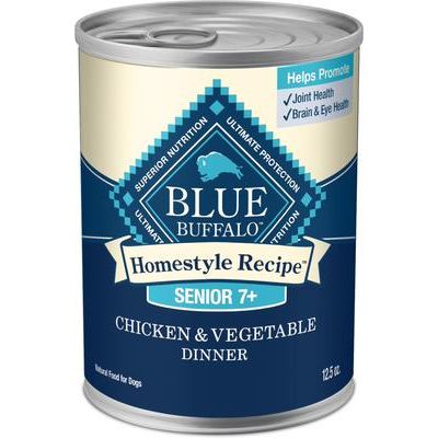 Blue Buffalo Homestyle Recipe Chicken Dinner with Garden Vegetables Senior Wet Dog Food, 12.5-oz, case of 12—Blue Buffalo Homestyle Recipe Senior Wet Dog Food is formulated to meet the nutritional needs of older dogs. It’s made with real, high-quality chicken as the first ingredient to help support healthy muscle maintenance. It also contains glucosamine and chondroitin to support joint health. Like all Blue Buffalo dog food, this wet food for dogs is formulated without any chicken (or poultry) by-product meals. It’s also free of corn, wheat, soy, artificial flavors, and preservatives. Serve on its own as a complete and balanced meal or mix it with dry food (sold separately) to make meals extra tasty.