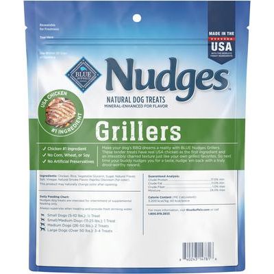 Blue Buffalo Nudges Grillers Chicken Dog Treats, 16-oz bag—Give your furbaby the taste of real chicken with Blue Buffalo Nudges Grillers Natural Dog Treats Made with Real Chicken Made with real USA chicken as the first ingredient, these treats for dogs have a tender texture and are easy to tear into smaller pieces. They’re great for dogs of all breed sizes and ages. And like all Blue Buffalo dog treats, these treats for dogs never contain chicken (or poultry) by-product meals, corn, wheat, soy, artificial flavors, or preservatives. Watch your best friend’s tail wag when you reward them with Blue Buffalo Nudges Grillers Natural Dog Treats Made with Real Chicken.
