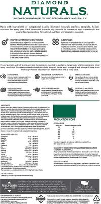 Give your large breed adult dog the superior nutrition she deserves! Each purchase comes with Diamond Naturals Large Breed Adult Chicken & Rice Formula Dry Dog Food, 40-lb bag & Diamond Naturals Chicken Dinner Adult & Puppy Canned Dog Food, 13.2-oz, case of 12. Diamond Naturals Large Breed Adult Chicken & Rice Formula Dry Dog Food is enhanced with superfoods and guaranteed probiotics to support your furry friend’s development and overall health. This large breed adult dry dog food recipe is made with real cage-free chicken, whole grain brown rice and real fruit and vegetables including kale, blueberries and coconut! It provides your furry friend with protein and minerals, along with omega fatty acids to help promote healthy skin and a shiny coat, plus antioxidants for overall nose-to-tail well-being. Diamond Naturals Chicken Dinner Adult & Puppy Canned Dog Food features high-quality, delicious chicken as the first ingredient, and plenty of protein to help support lean, active muscles. Made with a holistic approach to pet health, it’s also loaded with field veggies and superfoods for powerful antioxidants, plus vitamins and minerals for overall well-being in dogs of all sizes and ages. with real meat and whole-food ingredients in each tasty bite, it’s the flavor and nourishment dogs love—and you can feed it as a complete meal on its own or as a topper or mix-in for kibble.