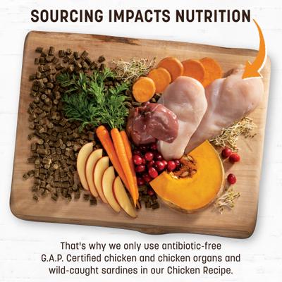 - Earth Animal Wisdom Air-Dried Chicken Recipe Premium Natural Dog Food, 2-lb bag—Made in the USA using antibiotic-free chicken organ and muscle meat with scrumptious sardines, ancient grains, fruits, vegetables plus added vitamins and minerals.