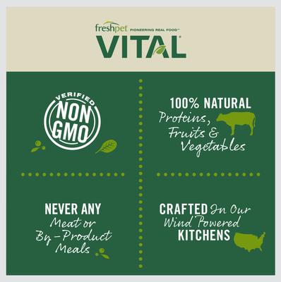 Freshpet Vital Chicken, Beef, Salmon & Egg Recipe Grain-Free Fresh Dog Food, 1.75-lb bag, case of 4 — Bring a fresh approach to your furry friend’s nutrition with Freshpet Vital Chicken, Beef, Salmon & Egg Recipe Grain-Free Fresh Dog Food! Even the pickiest pets love fresh meats and veggies. This grain-free recipe features nutrient-rich proteins, fruits and veggies, including 100% natural fresh chicken, beef, salmon, egg and antioxidant-rich spinach and cranberries. These wholesome ingredients are gently cooked, unlocking their nutritional benefits to help your canine companion thrive. Our Fresh and Prepared Meals include products that are gently cooked and minimally processed. These meals are sure to excite and fulfill your furry friend’s cravings.