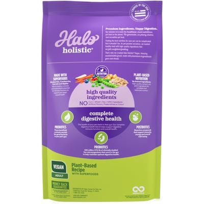 Halo Holistic Vegan Dog Food Complete Digestive Health Plant-Based Recipe with Superfoods Adult Formula Dry Dog Food, bolsa de 21 lb: ¡Dale a tu perro una comida nutricionalmente equilibrada con Halo Holistic Vegan Dog Food Complete Digestive Health Plant-Based Recipe with Superfoods Adult Formula Dry Dog Food Bag! Hecho con una variedad de ingredientes premium enriquecidos con vitaminas y minerales esenciales, este alimento para perros de origen vegetal es completamente vegano. Contiene arándanos azules, arándanos rojos, zanahorias, manzanas y más. Cada bocado contiene una mezcla de microflora digestiva beneficiosa, para que el estómago de tu amigo se mantenga en óptimas condiciones. También contiene ácidos grasos omega esenciales, que ayudan a mantener su piel y pelaje con un aspecto y una sensación hermosos. Estas croquetas están completamente libres de OGM, soya, maíz, trigo, colorantes, sabores y conservantes artificiales, lo que significa que le estás dando a tu cachorro solo los ingredientes más finos y saludables en cada comida.