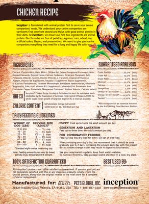 - Inception Chicken Recipe Dry Dog Food, 27-lb bag—The first 2 ingredients—chicken and chicken meal—will fuel your buddy’s adventures all day long.