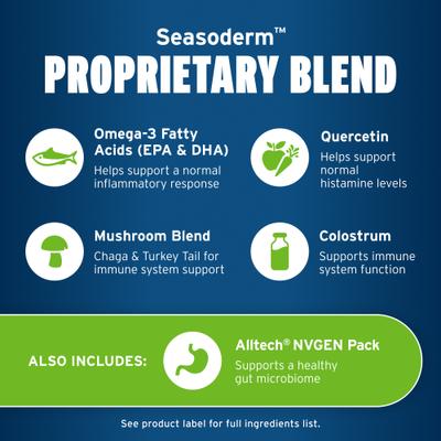 Pet Protect Allergy & Immune+ Supplement for Dogs, 60 count—Give your furry friend the support he needs with Pet Protect Allergy & Immune+ Soft Supplement for Dogs. These bacon-flavored chews help maintain normal histamine levels to provide support for seasonal allergies, healthy immune function, and a healthy gut. Formulated by vets, this supplement is powered by Alltech NVGEN Pack, quercetin, colostrum, omega-3 fatty acids, and a chaga and turkey tail mushroom blend. It's packed with what your pup needs to combat seasonal allergies and get back to enjoying every day.