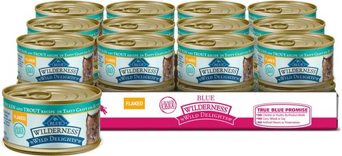 Blue Buffalo Wilderness Wild Delights Flaked Chicken & Trout in Tasty Gravy for Kittens Grain-Free Canned Cat Food, 3-oz, case of 24 — Stock up on a supper that satisfies with Blue Buffalo Wilderness Wild Delights High Protein Grain-Free, Natural Kitten Flaked Wet Cat Food. Purr-fect for your growing kitten, this irresistibly tasty wet food is made using only the finest naturally grain and gluten-free ingredients. It starts with high-protein chicken and trout, packed with healthy fruits and veggies, then enhanced with vitamins and minerals. Formulated with DHA, an important fatty acid found in mother’s milk, this delicious high-protein food helps support your kitty companion’s cognitive development. The exclusively wholesome ingredients do not contain any grain, gluten, by-product meals, corn, wheat, soy, artificial flavors or preservatives.