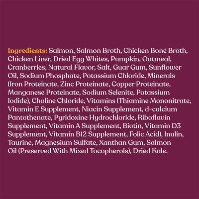- This wet cat food features sustainably sourced salmon, cranberries, and pumpkin.