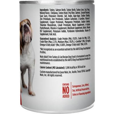 Nulo Freestyle Turkey & Cod Recipe Grain-Free Adult Trim enlatado, 355 g, caja de 12. ¡Ayuda a tu amigo peludo a recuperar su forma física con el alimento enlatado Nulo Freestyle Turkey and Cod Recipe Adult Trim! Este sabroso alimento húmedo para perros de bajo índice glucémico está diseñado para brindar el apoyo necesario para el control de peso de tu compañero canino, ¡a la vez que ofrece un delicioso sabor! Esta receta sin cereales le proporciona a tu mascota la dieta baja en grasas y proteínas magras que necesita, con pavo real, caldo de pavo, caldo de salmón, hígado de pavo y bacalao real como sus cinco ingredientes principales. Además, este alimento para perros de bajo índice glucémico no contiene maíz, trigo ni soja, lo que lo hace perfecto para mascotas con sensibilidades. ¡Usa esta deliciosa receta como dieta principal para tu precioso cachorro o como un delicioso complemento para su croqueta favorita!