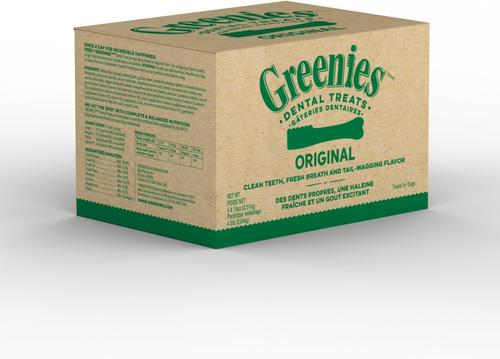 Greenies Regular Dental Dog Treats, 72 count—Support your furry sidekick’s dental health with Greenies Regular Dental Dog Treats! These delicious original flavor dental dog treats are crafted with an irresistibly chewy texture that helps remove plaque and tartar. These natural dog treats are paw-fect for at-home oral health care because they help promote oral hygiene, freshen breath and contain highly soluble ingredients that are safe and easy for your pup to digest. Plus, you can feel extra confident knowing that these whisker-licking treats promote your canine companion’s overall health with vitamins, minerals and other nutrients!