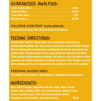 Rachael Ray Nutrish Burger Bites, Beef Burger with Bison Grain-Free Dog Treats, 12-oz bag—Your furry friend’s tail will be wagging with delight once he tries these Rachael Ray Nutrish Burger Bites, Beef Burger with Bison Grain-Free Dog Treats! Shaped just like mini burgers fresh off the grill, these goodies feature real beef as the very first ingredient. They also have a soft texture that’s easy to break apart for smaller pups, making them paw-fect for dogs of all sizes. Each batch is safely cooked in the USA with the world’s finest ingredients, and you can feel extra good knowing that there are no artificial flavors or meat by-products in this recipe. Plus, there are no added grain ingredients, either! You’ll love rewarding your paw-tner with these treats and he’ll love eating them!