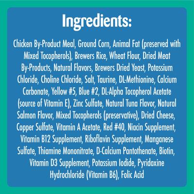 Temptations MixUps Meowmaid Salmon & Tuna Flavors Soft & Crunchy Cat Treats, 3-oz pouch — Bring the taste of the sea to your kitchen with the Temptations MixUps Meowmaid Salmon & Tuna Flavors Crunchy & Soft Cat Treats! Your cat will come running to the tasty morsels with a tender inside and a crunchy exterior. With the addicting flavors of salmon and tuna, you can’t go wrong! Each treat contains less than two calories, so you won’t feel bad giving your cat a meow-thful of these delicious snacks. They’re nutritionally balanced enough that you can use these meaty morsels as treats, food toppers and even a full meal. All of your cat’s favorite flavors in one—your four-legged friend will be “feline good!”