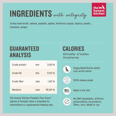 The Honest Kitchen Pumpkin POUR OVERS Salmon & Pumpkin Stew Wet Dog Food Topper, 5.5-oz, case of 12—Variety is the spice of life, so spice up your dog’s meal with The Honest Kitchen Pumpkin Pour Overs Salmon & Pumpkin Stew Wet Dog Food Topper! This human-grade pourable stew is crafted with whisker-licking ingredients, including wild-caught salmon, fiber-rich pumpkin and pureed apples with a dash of cinnamon. Pour Overs are a great way to add goodness to whatever is in your pet’s bowl and they come in an easy-to-use box for hassle-free serving!