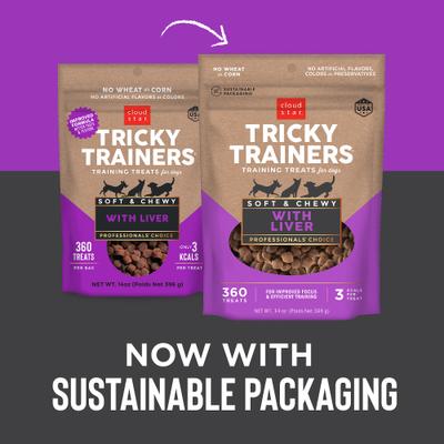 Cloud Star Chewy Tricky Trainers Liver Flavor Dog Treats, 14-oz bag—Who says you can’t teach an old dog new tricks? Young or old, dogs will flip for the amazing taste of Cloud Star's Tricky Trainers. These scrumptious little treats are just the right size for rewarding dogs for a job well done. Chewy Tricky Trainers stay soft and won’t dry out or crumble thanks to their wholesome ingredients. They’re the training treats with no hidden trick except tastiness!