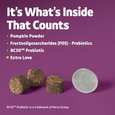 - Vibeful Probiotic Bites Pumpkin Flavored Soft Chews Digestive Supplement for Dogs, 14 count—With a whisker-licking, irresistible pumpkin flavor your pup will love, making it easy to give them their daily supplement.