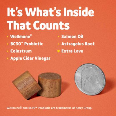 - Vibeful 10-in-1 Multivitamin Bites Chicken Flavored Soft Chews Supplement for Dogs, 14 count—Also contains BC30™ Probiotic to help maintain gut health, glucosamine and chondroitin to help support mobility, and omega fatty acids to backup that skin and coat health. This team was voted most likely to put the pep in your pup’s step!