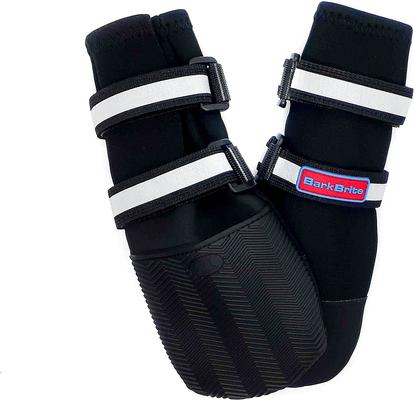Bark Brite All Weather Reflective Neoprene Dog Boots, 4 count, X-Large — Don't let the weather stop you from venturing into the great outdoors. Thanks to the neoprene cradle of All-Weather dog boots from Bark Brite, you can protect your best friend's paws and have a safe trip—no matter the elements. These superior shoes adapt to the shape of your canine's feet, ensuring a snug and comfortable fit while shielding paws from extreme temperatures, rocks and more. Scorching sidewalks and frozen streets don't stand a chance against these thick, non-slip soles! Whether it's the dead of winter or the height of summer, your furbaby's feet will be protected. Plus, with reflective straps, they're easy to take on and off—and even help your BFF stand out at night. After all, when it comes to your family, safety comes first.