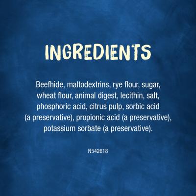 Beefhide, Rye Flour, Maltodextrins, Sugar, Animal Digest, Wheat Flour, Lecithin, Salt, Phosphoric Acid, Sorbic Acid (a Preservative), Citrus Fiber, Propionic Acid (a Preservative), Potassium Sorbate (a Preservative).