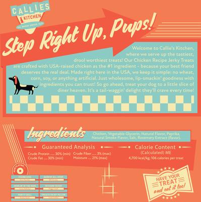 Indulge your furry friend with tasty treats from Callie’s Kitchen! Their Chicken Recipe Chicken Tenders Jerky Dog Treats are made with real, USA-raised chicken as the top ingredient. These treats are proudly made in the USA and contain no wheat, corn, soy, or artificial ingredients. Just pure, wholesome goodness that will make your pet’s tail wag with delight every time they get a taste. These limited-ingredient jerky tenders are a little slice of diner heaven!