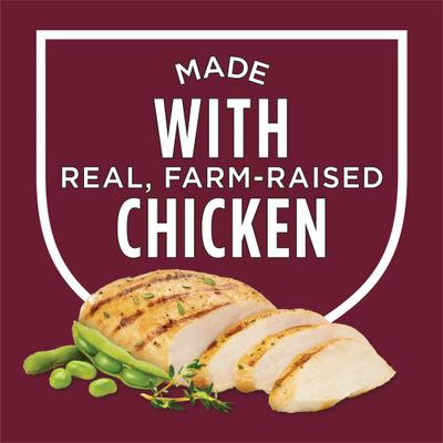 - Purina’s senior cat food is made with real farm-raised chicken for a high-quality kibble that provides 25 essential vitamins and minerals.