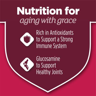 - This Purina dry cat food is formulated with glucosamine and antioxidants to support aging joints and a strong immune system.