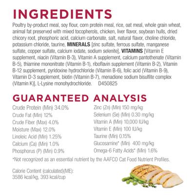 Poultry By-Product Meal, Soy Flour, Corn Protein Meal, Rice, Oat Meal, Whole Grain Wheat, Animal Fat Preserved With Mixed-Tocopherols, Chicken, Liver Flavor, Soybean Hulls, Dried Chicory Root, Phosphoric Acid, Calcium Carbonate, Salt, Natural Flavor, Choline Chloride, Potassium Chloride, Taurine, Minerals [Zinc Sulfate, Ferrous Sulfate, Manganese Sulfate, Copper Sulfate, Calcium Iodate, Sodium Selenite], Vitamins [Vitamin E Supplement, Niacin (Vitamin B-3), Vitamin A Supplement, Calcium Pantothenate (Vitamin B-5), Thiamine Mononitrate (Vitamin B-1), Riboflavin Supplement (Vitamin B-2), Vitamin B-12 Supplement, Pyridoxine Hydrochloride (Vitamin B-6), Folic Acid (Vitamin B-9), Vitamin D-3 Supplement, Biotin (Vitamin B-7), Menadione Sodium Bisulfite Complex (Vitamin K)], L-Lysine Monohydrochloride. D450825