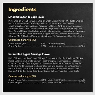 Cesar Classic Scrambled Egg & Sausage Flavor: Pork, Chicken Liver, Beef Lung, Chicken Broth, Water, Pork By-Products, Chicken Heart, Calcium Carbonate, Sodium Tripolyphosphate, Carrageenan, Potassium Chloride, Xanthan Gum, Magnesium Proteinate, Dried Yam, DL-Methionine, Salt, Erythorbic Acid (Preservative), Scrambled Egg and Sausage Flavor, Guar Gum, Natural Flavor, Zinc Sulfate, Vitamin E Supplement, Monocalcium Phosphate, Sodium Nitrite (For Color Retention), Copper Sulfate, Thiamine Mononitrate (Vitamin B1), D-Calcium Pantothenate, Vitamin D3 Supplement, Potassium Iodide