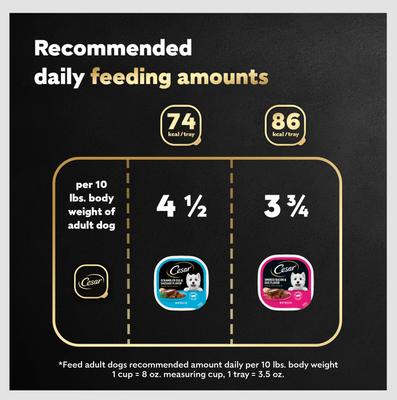 Cesar Classic Smoked Bacon & Egg Flavor:Feed adult dogs approximately 3 3/4 trays daily per 10 lbs. body weight.