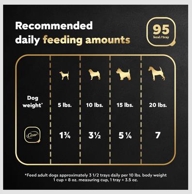 Feed adult dogs approximately 3 ½ trays daily per 10 lbs. body weight