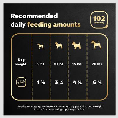 Feed adult dogs approximately 3 1/4 trays daily per 10 lbs. body weight