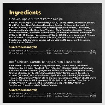 Beef, Chicken, Carrots, Barley & Green Beans Recipe:Beef, Water, Chicken, Carrots, Barley, Green Beans, Tapioca Starch, Powdered Cellulose, Soy Oil, Dried Plain Beet Fiber, Potassium Chloride, Tricalcium Phosphate, Calcium Carbonate, Minerals [Magnesium Sulfate, Zinc Sulfate, Manganese Sulfate], Choline Chloride, Soy Lecithin, Salt, Ascorbic Acid, Vitamins [Alpha-Tocopherol Acetate (Vitamin E), Niacin Supplement, Pyridoxine Hydrochloride (Vitamin B6), Thiamine Mononitrate (Vitamin B1), D-Calcium Pantothenate (Vitamin B5), Riboflavin (Vitamin B2), Vitamin B12 Supplement, Biotin, Folic Acid], Xanthan Gum, Ferrous Sulfate, Vitamin A Supplement, Beta Carotene, Copper Sulfate, Vitamin D3 Supplement, Sodium Selenite, Potassium Iodide.