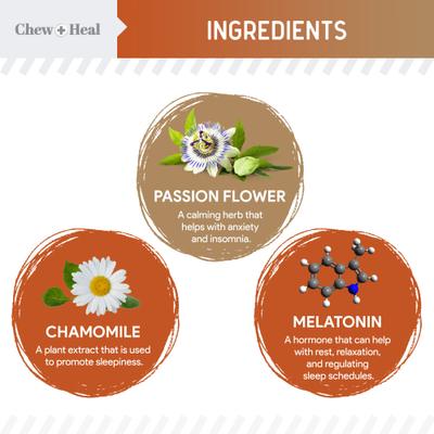 Keep your furry friend calm and relaxed with Chew + Heal Anxiety + Stress Classic Chicken & Peanut Butter Flavored Soft Chews Supplement for Dogs. These tasty chews come in two delicious flavors and are packed with calming ingredients to support your pup during stressful situations like fireworks, vet visits, and car rides. Passion flower, melatonin, thiamine, and L-tryptophan work together to reduce anxiety and curb behaviors like excessive barking or hyperactivity. Plus, ginger and chamomile help soothe upset stomachs. Made in the USA, these chews are the perfect way to help your pup unwind and relax.