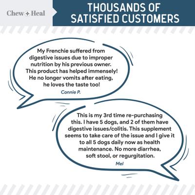 For a happy tummy and full-body nutritional support, try Chew + Heal Essential 12-in-1 Multifunctional Support Chews Dog Supplement & Chew + Heal Digestive Enzymes Chews Dog Supplement. This supplement duo is designed to aid digestion and keep your pup feeling their best. Digestive Enzymes Chews feature pre- and probiotics to promote a healthy digestive system. The powerhouse chews can help improve nutrient absorption and provide relief from upset stomach and diarrhea. For best results, combine it with the included 12-in-1 Essential Multivitamin to give your furry friend an overall wellness boost with a specific focus on tummy health.