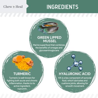 Senior Hip + Joint Active Ingredients: Glucosamine HCl (Shellfish Source) 400 mg | Methylsulfonylmethane (MSM) 250 mg | Calcium Ascorbate (Vitamin C) 112 mg | Green Lipped Mussel (Perna canaliculus) 100 mg | Omega-3 Fatty Acids (Flaxseed, Fish Oil, Lecithin, Salmon Oil) 100 mg | Yucca schidigera 50 mg | Chondroitin Sulfate (Porcine Source) 50 mg | Turmeric 50 mg | Omega-6 Fatty Acids (Flaxseed, Fish Oil, Lecithin) 25 mg | Hyaluronic Acid 5 mg | DL-alpha-tocopheryl acetate (Vitamin E) 50 IU | Senior Hip + Joint Inactive Ingredients: Brewers Dried Yeast, Citric Acid, Glycerin, Lecithin, Mixed Tocopherols, Natural Flavoring, Potato, Rosemary Extract, Silicon Dioxide, Sorbic Acid, Tapioca Starch, Vegetable Oil, Water.Vegetable Oil, Water